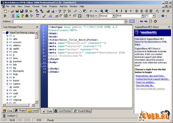 BestAddress HTML Editor – полнофункциональный HTML-редактор от компании Multimedia Australia, позволяющий без особого труда создать собственный сайт в сети Интернет. Программа умеет создавать меню на основе DHTML-кода, проверяет синтаксис, подчеркивает ошибки, обладает поддержкой интеллектуального ввода кода, обладает богатым набором встроенных шаблонов и может быть использована для обновления ранее созданного ресурса. Пользователям программы доступна помощь в режиме онлайн, которая содержит всесторонние рекомендации по работе с утилитой, информацию консультационного характера и исчерпывающую справочную информацию о HTML-коде версии 4.01 и CSS2.