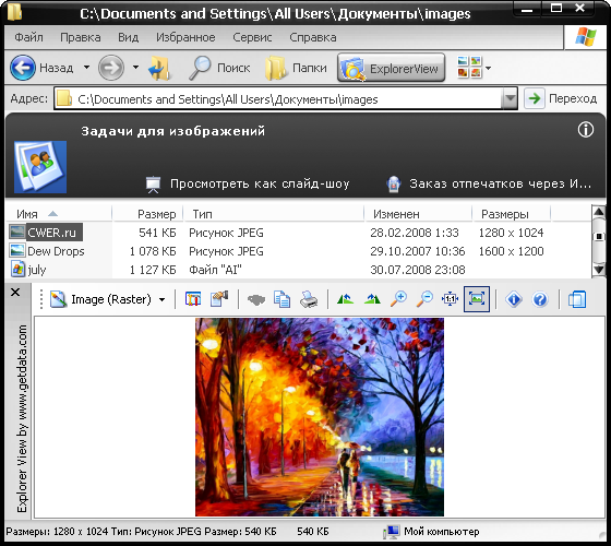 GetData Explorer View for Windows Explorer - утилита для просмотра различных типов графических, текстовых и мультимедийных файлов непосредственно в проводнике Windows. Для просмотра не требуется наличие установленных программ, которые ассоциированы с данным типом файла. Программа интегрируется непосредственно в проводник и позволяет просматривать файлы в окне проводника. Поддерживается просмотр большого количества типов файлов, включая PDF, DOCX, DWG, ODT, JPEG, PPT, PSD, WAV, WVW и многие другие. Кроме просмотра программа позволяет копировать и распечатывать файлы прямо из проводника. Также в данной программа имеется опция выноса области просмотра в отдельное окно.