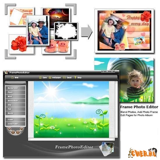 Программа позволит легко и быстро вставить фотографии в эффектные рамки. Удачно подобранное обрамление придаcт изображению законченный и гармоничный вид. Вы можете повернуть фотографию и изменить её размеры, подставить любой задний план, наложить картинки и текст. Свои коллажи Вы можете отправить по почте вашим друзьям или установить как настольные обои.