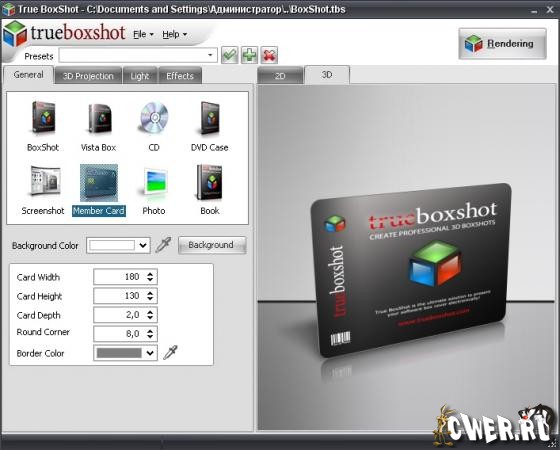 TBS Cover Editor - удобный инструмент создания качественных 3D снимков виртуальных коробок DVD и CD, обложек книг, кредитных карт, корпусов гаджетов, сувениров или коробок для ваших программ, фильмов, музыки, электронных книг и других продуктов.