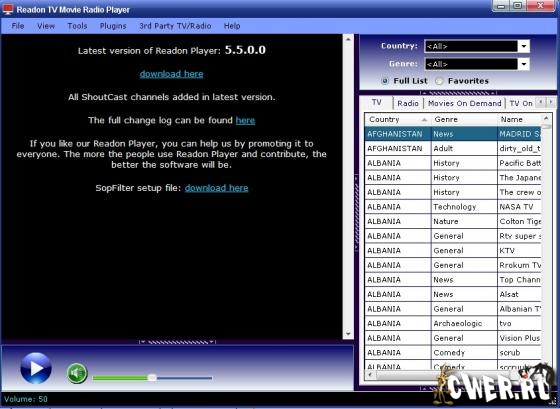 Readon TV Movie Radio Player 5.5.0.0 представляет собой программу, с помощью которой Вы сможете просматривать тысячи различных каналов Интернет-телевидения и Интернет-радио. Понравившиеся музыкальные композиции можно сохранить в формате mp3. Программа имеет удобный интерфейс: все каналы разбиты по странам (есть несколько десятков на русском языке) и категориям. Readon TV Movie Radio Player 5.5.0.0 - это действительно лучший программный продукт в своей области.
