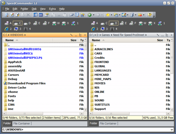 Speed Commander — это комфортабельный файловый менеджер, выполненный по стандартной двухоконной технологии и позволяющий просто управлять файлами (копировать, перемещать, удалять, сортировать и т.д.) при помощи мышки и/или клавиатуры. SpeedCommander умеет читать и создавать архивы (ACE, ARJ, BZIP, GZIP, JAR, LZH, RAR, SQX, TAR, UUE, ZIP), обрабатывать CAB-файлы, имеет мощную систему шифрования файлов (файлы сжимаются - внутренняя поддержка ARJ, ZIP, LHA, RAR, CAB, ACE, GZIP, TAR и UUE, затем шифруются по стойкому алгоритму DES, а потом еще и их названия можно защитить паролем) и т.д. Имеется встроенный поисковый движок и просматривальщик файлов, понимающий до 80 типов графических и текстовых форматов. В дополнение SpeedCommander содержит неплохой тестовый редактор, FTP-клиент и может интегрироваться с веб-браузером.