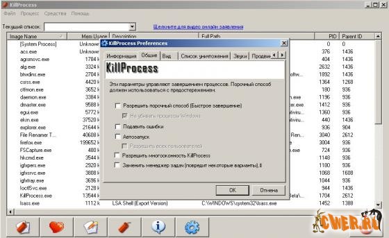 Программа для управления запущенными процессами, способная заменить стандартный Диспетчер задач. Используя эту утилиту, завершить выполнение какой-либо программы или сервиса можно вручную или в автоматическом режиме. В последнем случае программа позволяет создавать специальный список, содержащий названия программ, которые будут завершаться автоматически. Кроме этого имеется возможность постоянного автоматического завершения конкретного процесса, как только он запускается (такое может быть при поражении компьютера вирусом). По каждому процессу можно получить основные сведения (адрес в памяти, занимаемый размер, наличие цифровой подписи и т.д.). В настойках программы можно установить горячие клавиши и звуковые сигналы на разные действия приложения.