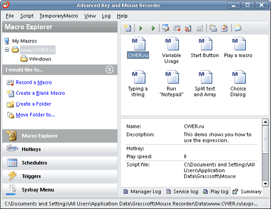 Программа создана для записи и воспроизведения действий клавиатуры и мыши с целью автоматизации повторяющихся заданий. Вы можете использовать программу для записи и сохранения движений и кликов мыши, нажатий клавиш в любом приложении - в играх, программах для рисования, обработки текста и т.д. Затем вы можете воспроизвести записанные действия.